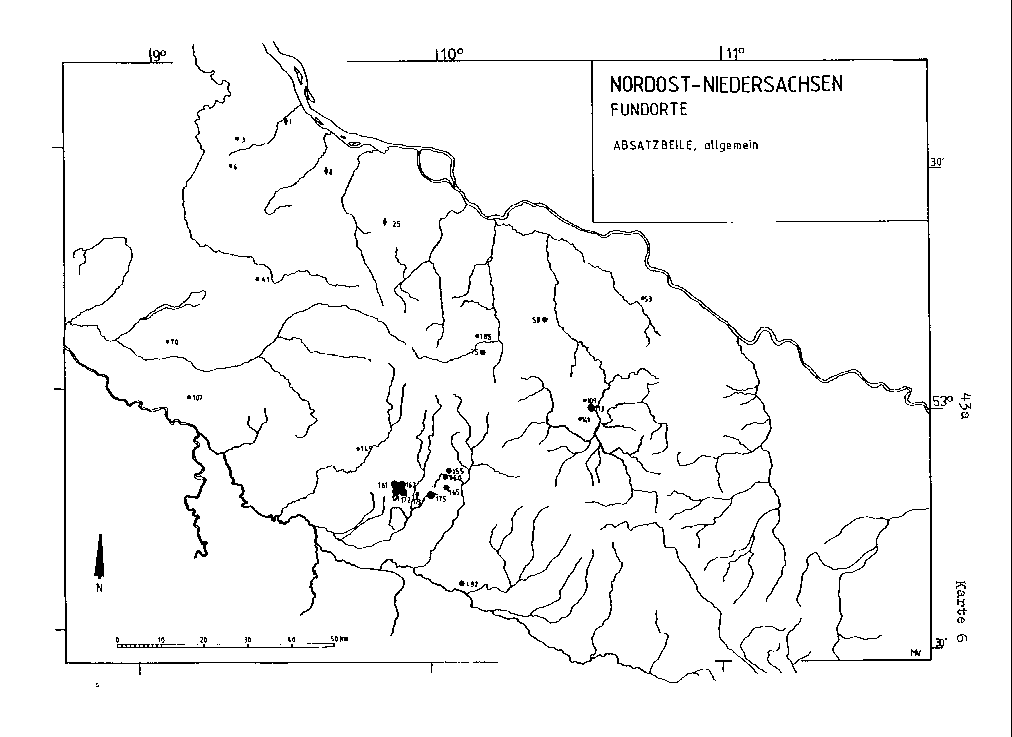 Aus diesem unterschiedlichen räumlichen Vorhandensein von verschiedenen Formengruppen, welches auch durch andere Kartierungen belegt wird, muß der Schluß gezogen werden, daß hiermit auch menschliche Gruppen mit unterschiedlichem räumlichen Verhalten erfaßt worden sind, woraus sich wiederum ergibt, daß es notwendig ist, die Funde aus den erkannten Regionen im chronologischen Arbeitsgang getrennt zu betrachten (vgl. ZIEGERT 1983, 37).