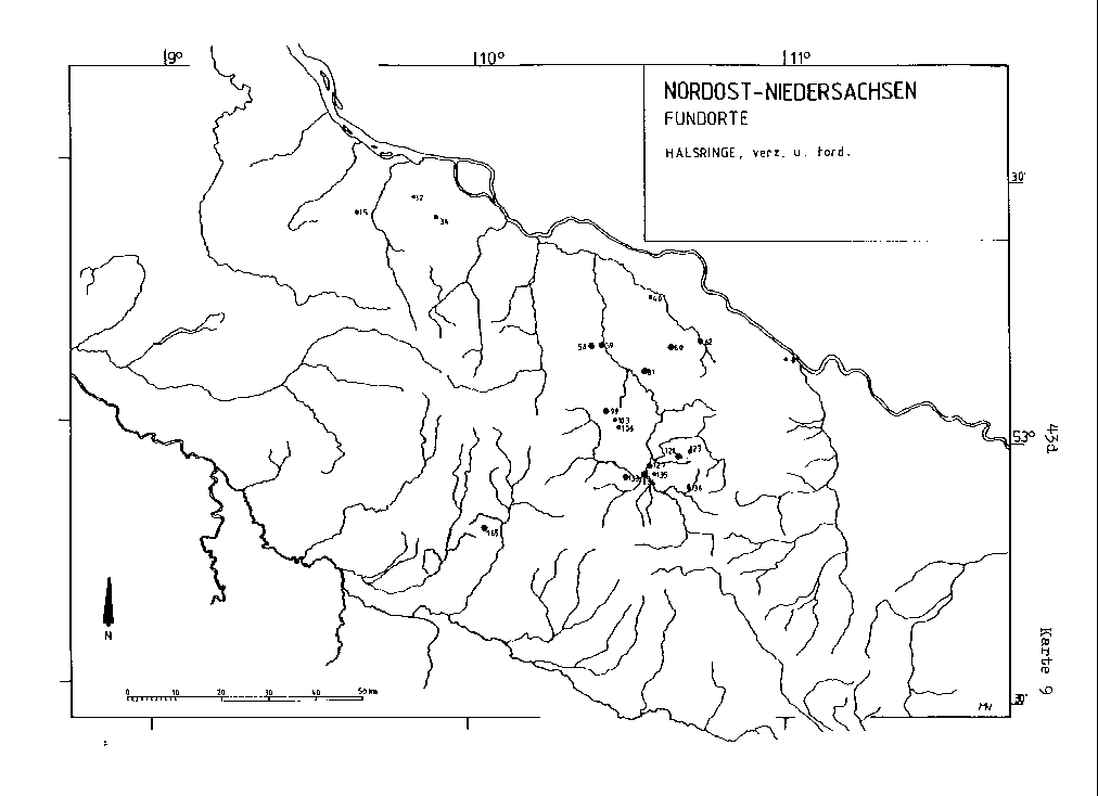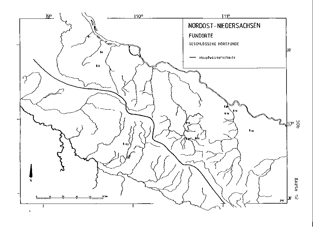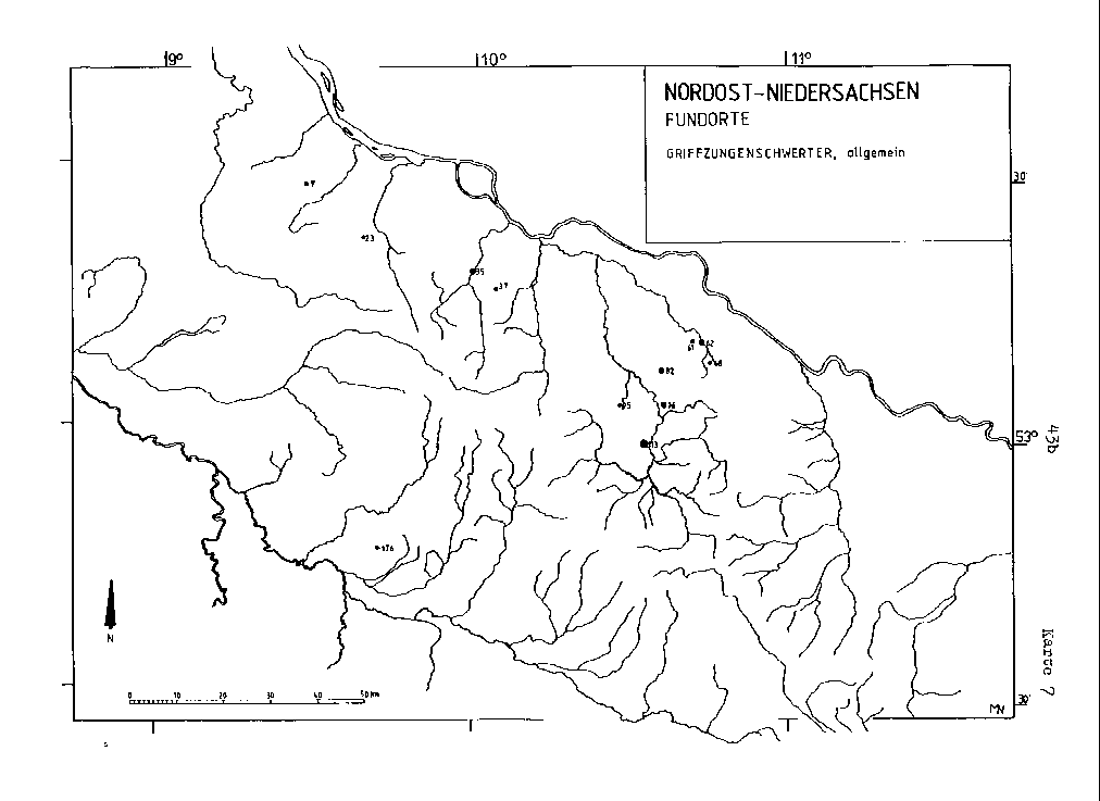 Griffzungenschwerter und die verzierten, bzw. tordierten Halsringe sind nur im Norden Nordost-Niedersachsens, mit jeweils einer Ausnahme, vertreten. Eine gewisse Konzentration deutet sich, wiederum bei beiden, im Gebiet der östlichen Luheheide und im Uelzener Becken an.