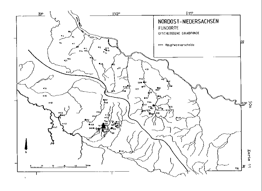 Im Arbeitsgebiet konnte aufgrund der speziellen naturräumlichen Struktur eine Differenzierung in einen Nord- und in einen Südteil der Lüneburger Heide vorgenommen werden (s. Abschn. 3.1.1 ). Der Blick auf die kartographische Zusammenfassung der räumlichen Quellenverteilung mit den orographischen Gegebenheiten (Karte 10) läßt erkennen, daß im Gebiet der sich von der Wümmeniederung nach Osten erstreckenden Hohen Heide und des Lüßplateaus auffallend wenige Fundpunkte vorhanden sind. Diese fundarmen, bzw. fundleeren, Räume decken sich mit den Grenzsäumen der auf den Karten 6-9 erkannten Formenkreise. Daraus kann nun der Schluß gezogen werden, daß hier gewisse, noch nicht näher präzisierbare, Abhängigkeiten bestehen, die zur Nutzung dieses Höhenzuges als Trennungsraum berechtigen. Als Grenze zwischen den beiden regionalen Materialgruppen kann somit die auf dem Höhenzug verlaufende Hauptwasserscheide konstruiert werden, die auch in ihrer weiteren Erstreckung die Trennungslinie bilden soll.