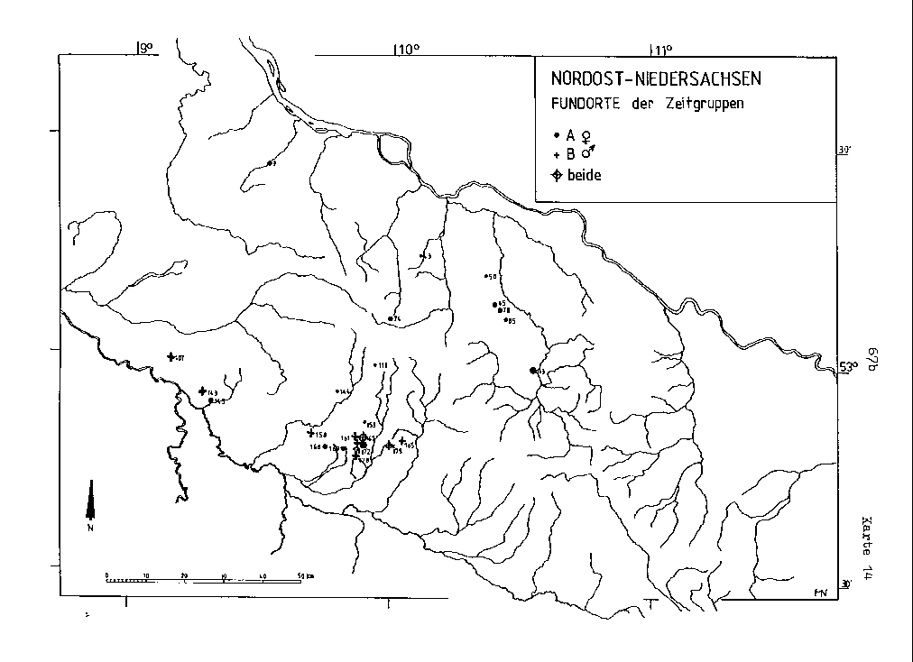Karte 13 Die wenigen, weit gestreuten Fundpunkte des Zeithorizontes A/m lassen den Schluß zu, daß es sich hierbei um Erscheinungen mit lokaler Bedeutung handelt. Die relative Fundhäufung im südlichen Bereich ist wohl eher als ein Resultat intensiverer Forschung, denn als Konzentration im besiedlungsgeschichtlichen Sinne zu verstehen. Es erscheint trotz der nur geringen Anzahl bemerkenswert, daß aus dem östlichen Teil des Arbeitsgebietes keine Funde dieses Horizontes, d.h. solche mit mindestens zwei mehr oder weniger sicher vergesellschafteten Objekten, aufgefunden worden sind. Wenn diese Fundorte in Auslegung der obigen Voraussetzung nicht als Ausdruck eines Erstbesiedlungsvorganges gewertet werden, so muß gefolgert werden, daß diesem frühesten Bronzezeithorizont, auch wegen des Fehlens synchronisierbarer Frauengräber, möglicherweise spät- oder endneolithische Erscheinungen (Problem: Hügelbestattungen ohne Beifunde) zeitlich parallelisiert werden müssen. Damit wären dann diese Grabinventare, da in Nordost-Niedersachsen weder natürliche Kupfer- noch Zinnvorkommen ins Kalkül gezogen werden können, als früheste Zeugnisse von Metall- bzw. Bronzeprodukt-Importen aufzufassen.