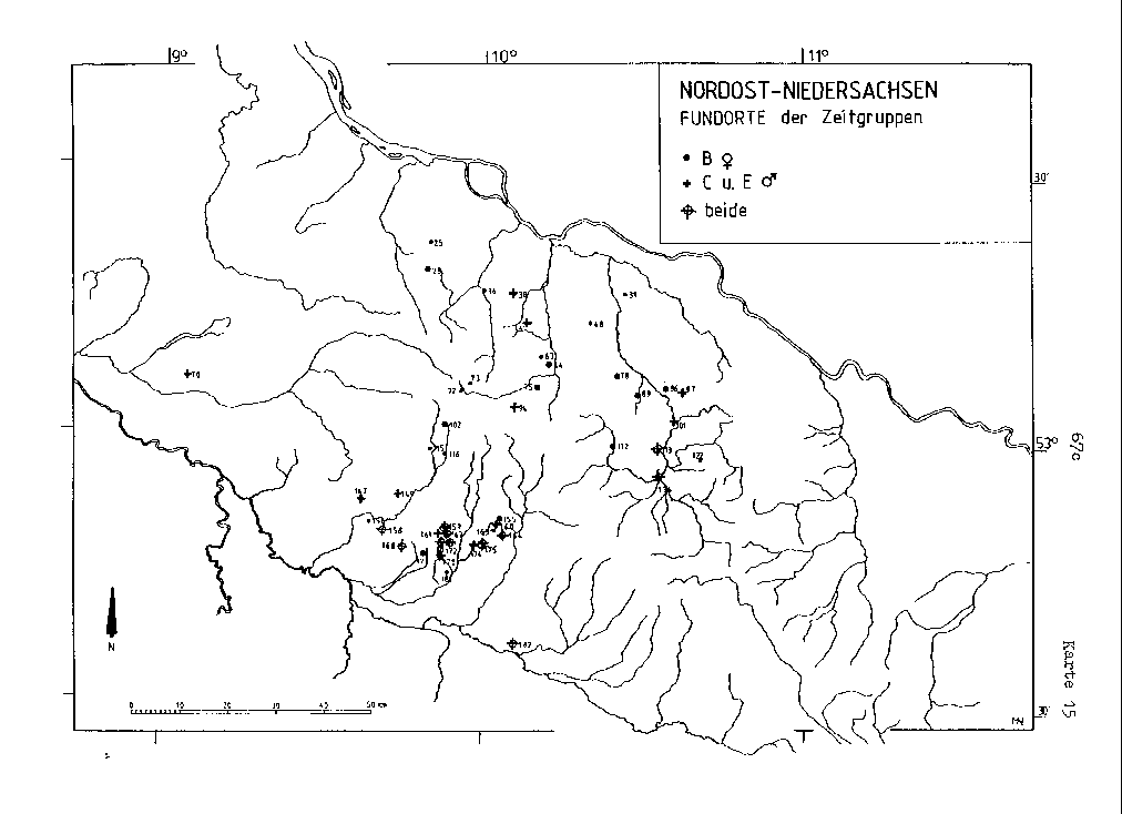 Karte 15 Im Vergleich zu Karte 14 zeigt sich die Beibehaltung des südlichen Kernraumes der Verbreitung mit einer leichten Zunahme der Fundortanzahl. Die hier zusammen kartierten weiblichen und männlichen Leithorizonte B/w - C, E/m verweisen durch ihre häufige Bestattungsvergesellschaftung in gleichen Gräberfeldern und zusätzlich auch in Hügeln mit mehrfacher Belegung auf ihre weitgehende zeitliche Kongruenz. Im nördlichen Teilraum läßt sich unter Beibehaltung allgemein ähnlicher Fundräume zu der oben betrachteten Zeitgruppierung eine verstärkte Einbeziehung der Luheheide und des Uelzener Beckens erkennen. Da der zeitlichen Kategorisierung nur relative Aussagen zu einer.jeweils älteren oder jüngeren Stellung im System zu entnehmen sind, Hinweise auf die Zeitdauer des prägenden Einflußes der Leittypen auf die Inventarkomplexe somit fehlen, kann die erhöhte Anzahl der Fundorte dieser oder auch anderer Leithorizonte nicht als Ausdruck einer Besiedlungsintensivierung interpretiert werden.