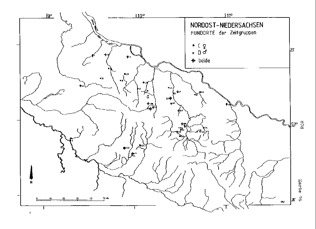 Auf den wichtigsten Fund, der gleichermaßen Typen beider Geschlechtsgruppen beinhaltet, wurde bereits oben verwiesen. Die in Melbeck, Kr. Lüneburg (FO-Nr. 58) in Hügel 3 geschlossen vergesellschafteten Objekte gehören einerseits dem weiblichen Leithorizont C/w und dem männlichen Horizont D/m an. Damit ist der entscheidende Parallelisierungsfixpunkt festgelegt.