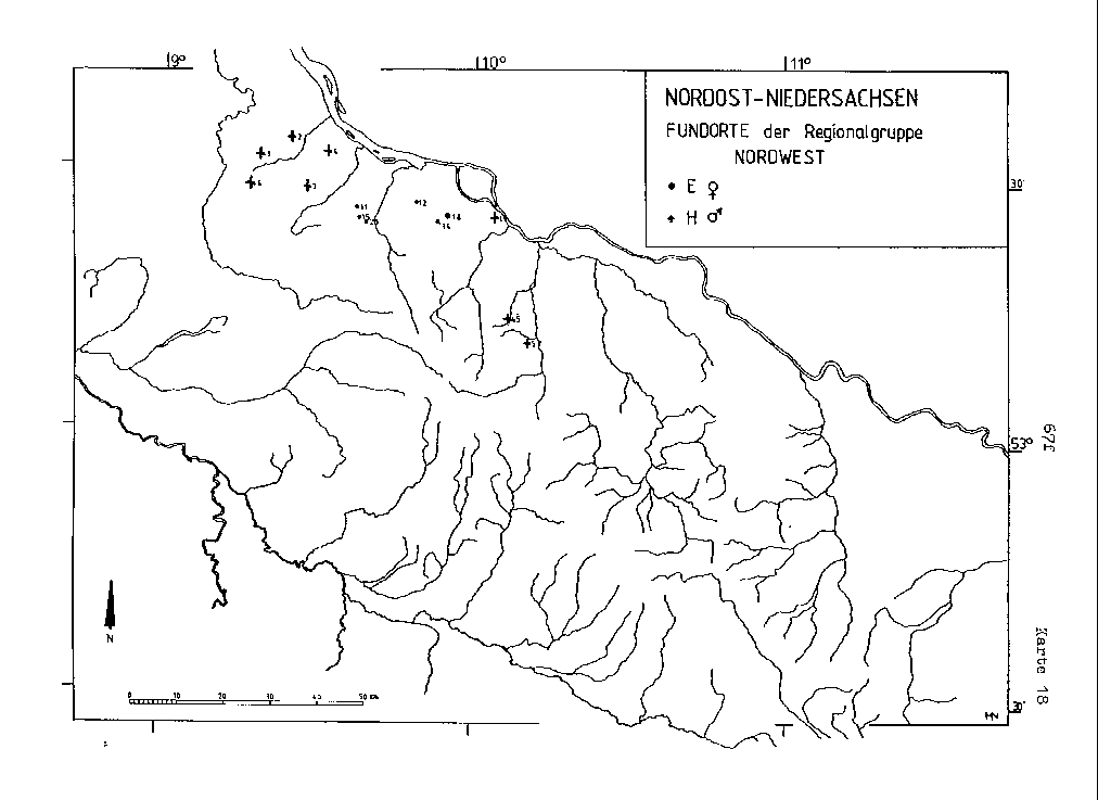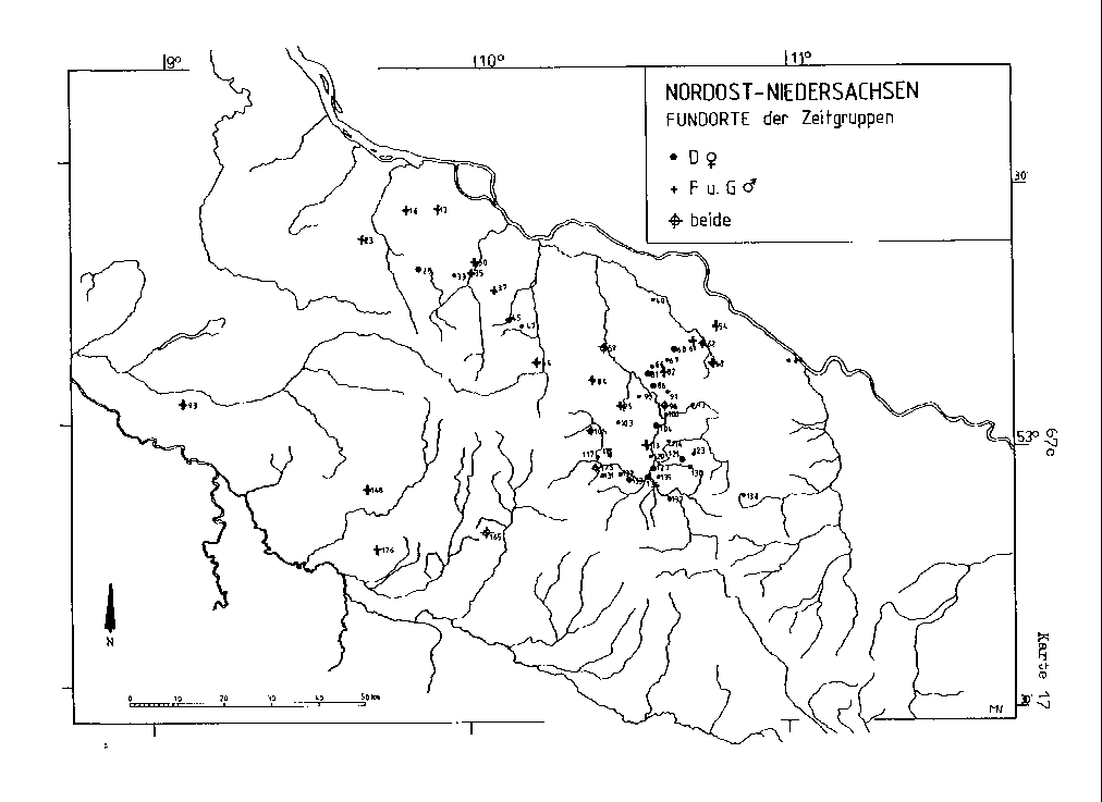 Karte 17 In dieser Kartierung (D/w - F, G/m) ist ein vergleichbares, jetzt aber wesentlich stärker und deutlicher hervortretendes Konzentrationsphänomen im gesamten Bereich des Gewässersystems der Ilmenau festzustellen, wobei außer dem Uelzener Becken das nördlich davon gelegene Gebiet der Ostheide eine hohe Anzahl von Fundpunkten aufweist. Für das übrige Arbeitsgebiet gilt wie bei der letztbehandelten Gruppe die fast ausschließliche Verbreitung über die nördliche Region, womit sich die räumlich weitgehende Ähnlichkeit als zeitliche Kontinuitätsfolge interpretieren läßt.