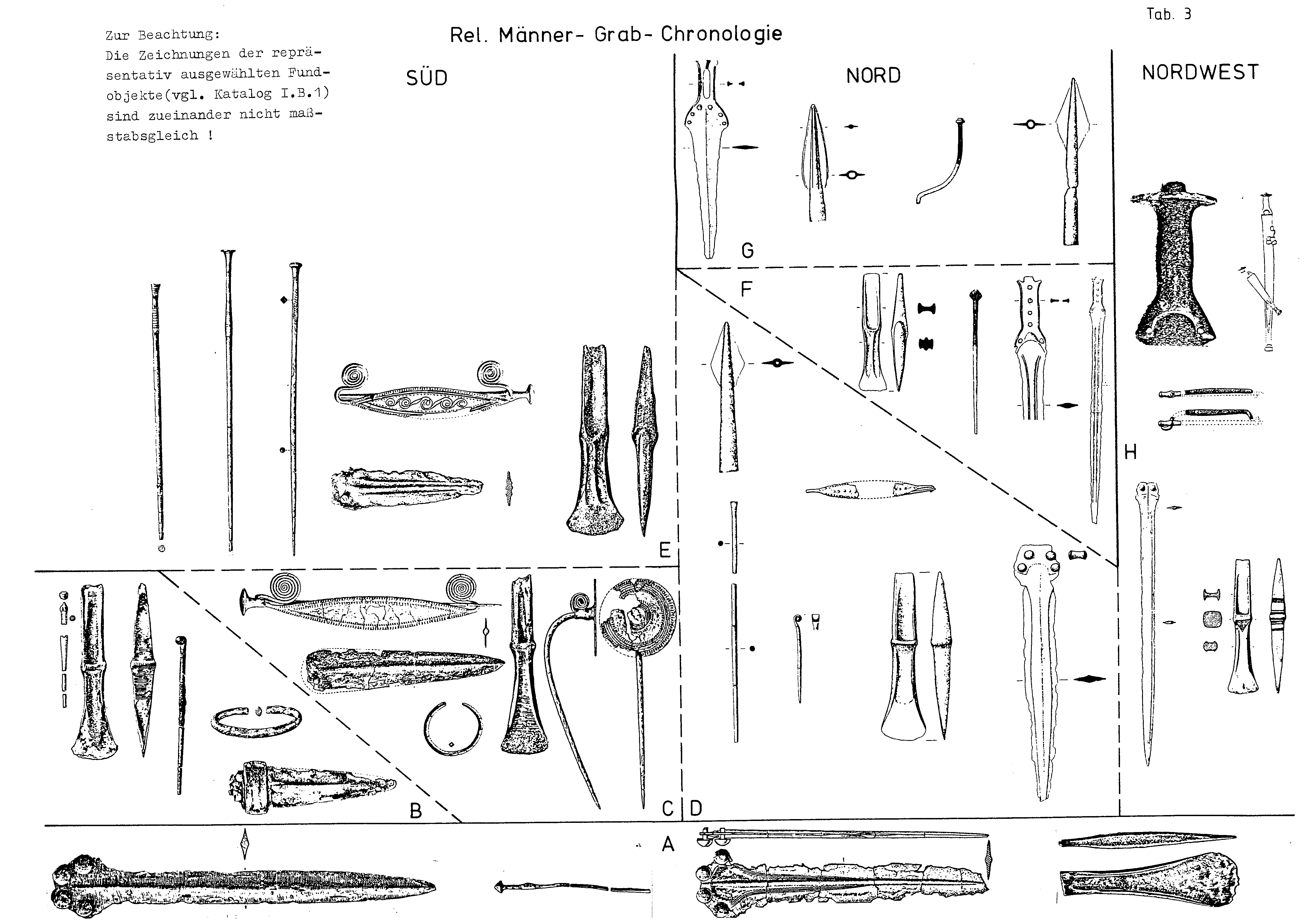 Der differenzierten Erkennbarkeit von Leithorizonten mit ihren Leittypen entspricht das gegenüber der relativen Frauengrab-Chronologie komplizierter erscheinende Schema der Männergrab-Chronologie in Tabelle 3, welches im folgenden begründet werden soll: