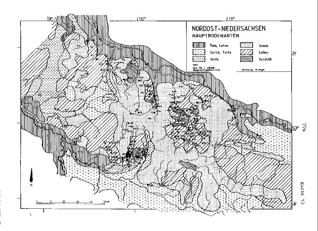 Damit kann vermerkt werden, daß sich der eigentliche Besiedlungsraum auf die Bereiche beschränkt, deren naturräumliche Merkmale mit dem Begriff Niedere Geest verknüpft werden können. Die darüber hinaus vorhandenen Fundpunkte verweisen auf die wohl gleichermaßen wichtige Bindung an Lehm oder Sandlößböden als dazukommende Lagevoraussetzung, welche eindeutig eine Vorzugsstellung gegenüber Standortbereichen mit sandigen Substraten einehmen. Dies wird durch die Grabfunde, die hier in vorwiegend Sande aufweisenden Gebieten kartiert sind, eher noch bestätigt, da sich in deren Nähe meist auch lehmigere Bodenarten nachweisen lassen, andererseits muß aber auch bedacht werden, daß sich die Qualität dieser Böden nicht mit heute bestehenden Verhältnissen vergleichen lassen muß (s. Abschn. 2.3). Mit gewisser Vorsicht soll die, in den Verbreitungsdaten einige Hinweise findende, Hypothese aufgestellt werden, daß gerade in den frühesten Leithorizonten (vgl. Karten 13/14) eine stärkere Beziehung zu Sandlößflächen besteht, eine genauere Analyse der speziellen Lagebedingungen muß jedoch einer kleinräumigeren Untersuchung vorbehalten bleiben.